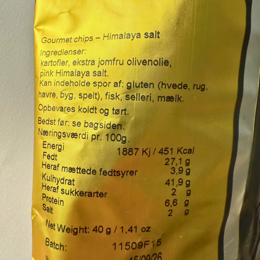 Se hele informationSnackgold chips - Extra virgin olive oil og pink himalaya salt. Virkelig lækre og sprøde gourmet chips fra Spanien hvor der ikke er gået på komprom...