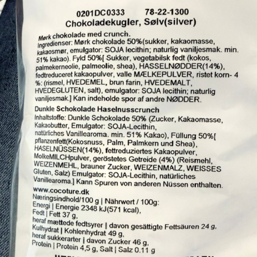 Se hele informationFyldt chokoladekugle med crispy kerne – indeholder mørk chokolade a 50% kakao. Ca. 14 g pr. chokoladekugle.