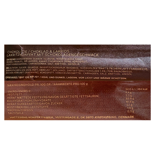 Se hele informationHattesen's Konfektfabrik har lavet disse lækre poser med små stykker lakridskonfekt. Denne variant kombinerer mørk chokolade med intens lakrids, i...