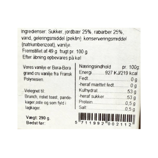 Se hele informationLækker marmelade med jordbær og rabarber. En klassisk marmelade som passer perfekt som fyld til sine pandekager, til frisk franskbrød, til osten el...