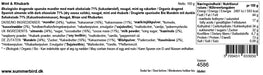 Ingredienser: *Mandler (29%), *rørsukker, *kakaosmør (15%), *kakaomasse (14%), *mælk/mjölkpulver, *flormelis, *hasselnødder, *hindbær/bringebær/hallonpulver, *rabarberpulver (1%), vaniljeekstrakt, *maltodextrin, emulgator (*sojalecitin), *pebermynteolie. Kan indeholde spor af æg og nødder.