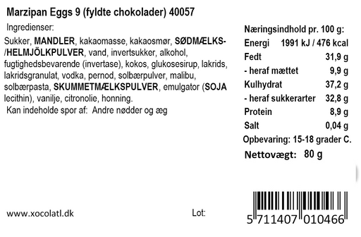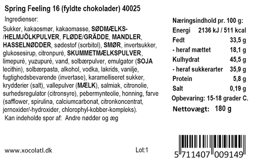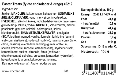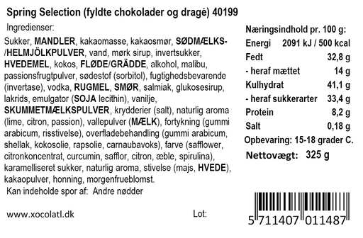Se hele informationLakrids med hvid chokolade og lime, marcipanstænger overtrukket med mørk chokolade,chokoladepoletter med karamelfyld, sprøde mandler med hvid choko...