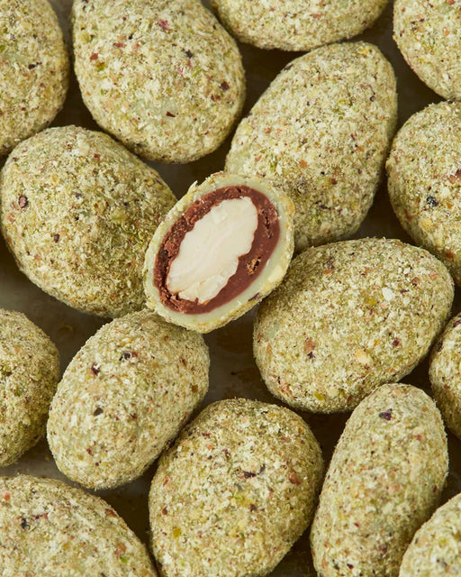 Se hele informationGourmet vaniljeskumfiduser, drageret i hånden i cremet belgisk hvid chokolade og let tilsat naturlig pistaciesmag, som fremhæver pistaciens rige o...