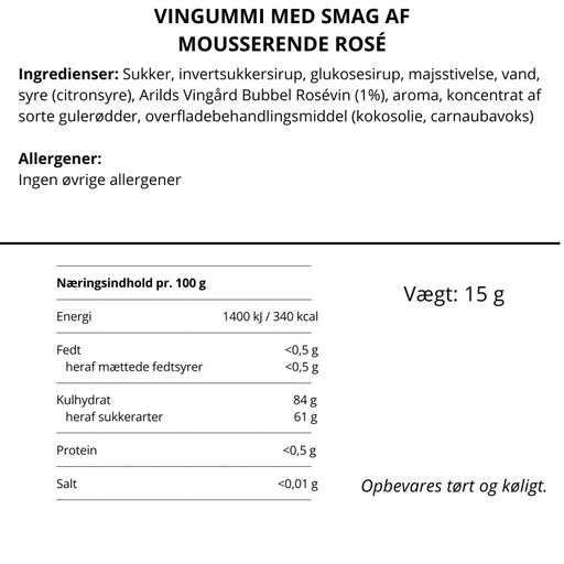 Se hele informationStore bløde cocktailvingummier - lavet på sparkling rosé fra Arilds Vingård i Skåne. Den søde vingummi har de karakteristiske bærnoter, som du ken...