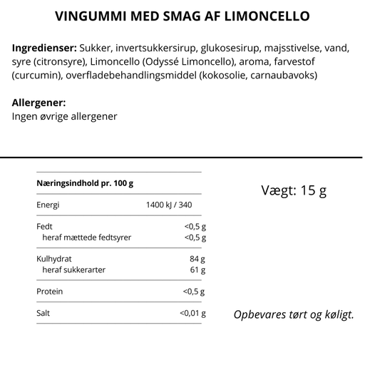 Se hele informationVores Cocktail Vingummi med Limoncello kombinerer den friske og syrlige smag af citron, med den klassiske italienske likør, Limoncello. Den bløde, ...