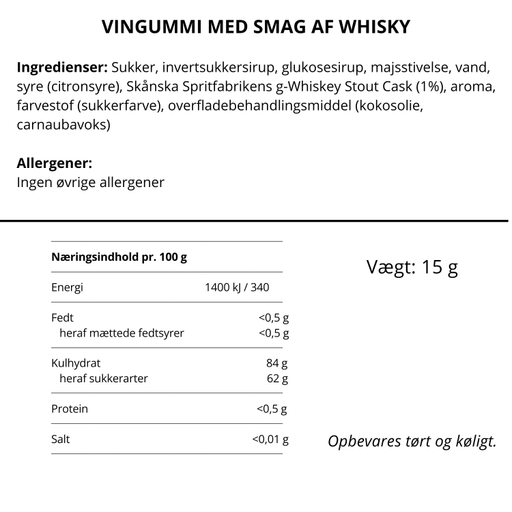 Se hele informationStore bløde cocktailvingummier - lavet på Skånska Spritfabrikens g-Whiskey Stout Cask, som er fremstillet på bygmalt fra Skåne og lagret på egetræs...