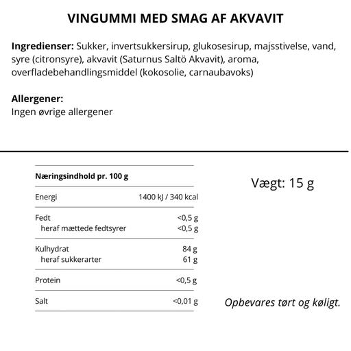 Se hele informationStore bløde cocktailvingummier - lavet på Saltö Aquavit fra Saturnus distilleri i Sverige. Ud over akvavitten som grundsmag, er vingummierne nøje t...