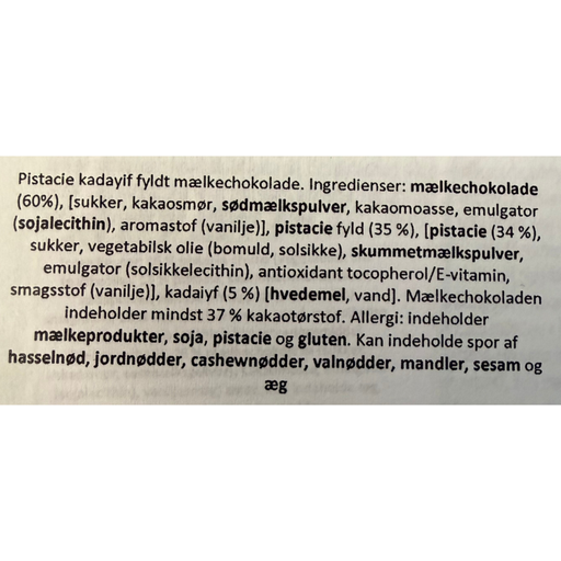 Se hele informationBest before 31-01-2026 Oplev den populære dubai chokolade. En kombination af lækker chokolade og knasende pistachie fyld. Indeholder: 180 g