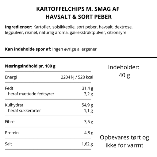 Se hele informationLækre chips med sort peber og havsalt, lavet med fyldige Tellicherry-peberkorn, der giver en kraftig og aromatisk smag. Et velsmagende alternativ t...