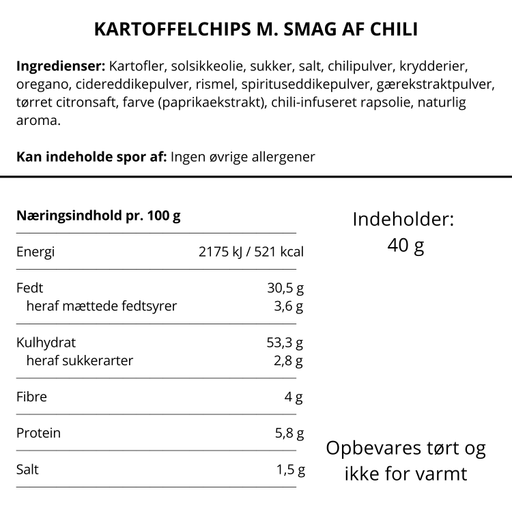 Se hele informationLækre chips med sød chili lavet af en blanding af cayenne- og jalapeñopeber. Den unikke krydderiblanding giver et behageligt stærkt kick m...